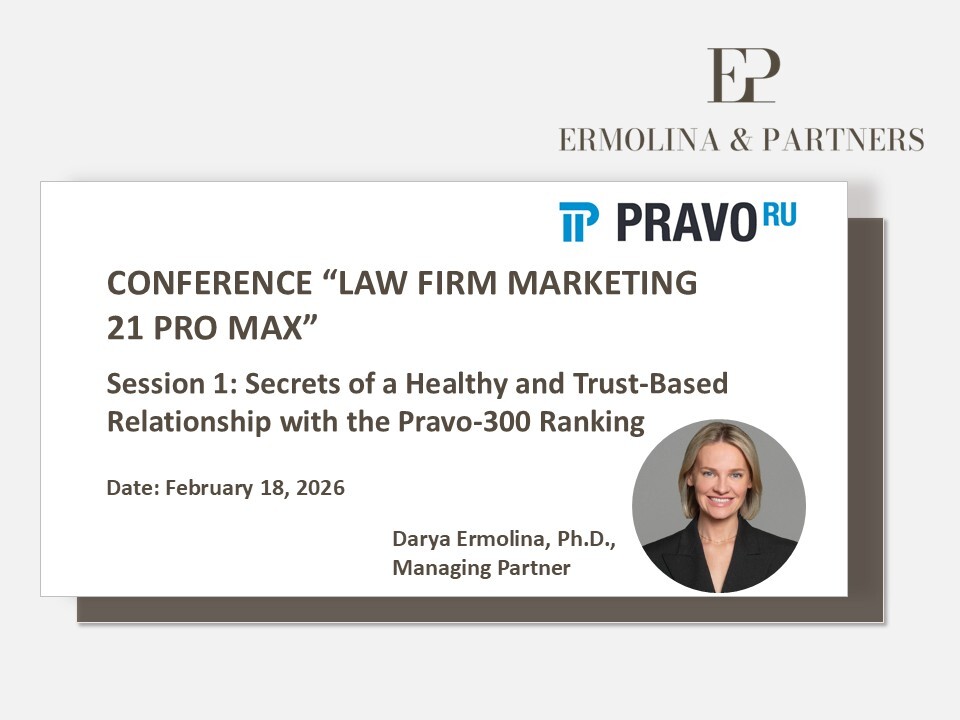 Darya Ermolina, Managing Partner of Ermolina & Partners, will participate in Session 1, Secrets of a Healthy and Trust-Based Relationship with the Pravo-300 Ranking. As part of the topic Expanding Horizons: Strategies for Boutique Law Firms Entering New Practice Areas, Darya will address: